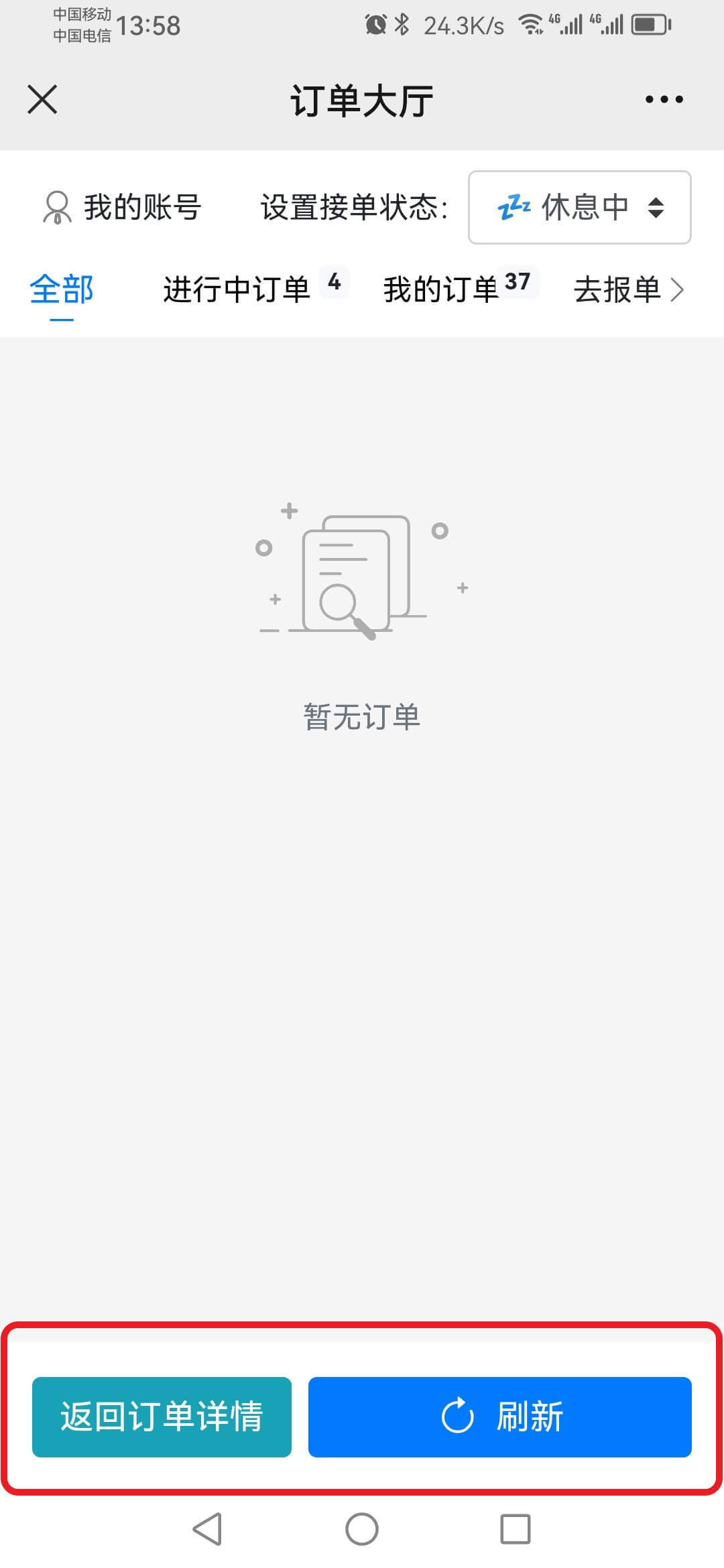 4.订单大厅底部出现刷新、返回订单详情按钮,即表示已成功完成注册流程。之后在右上角将接单状态切换为【工作中】即可正常接单。