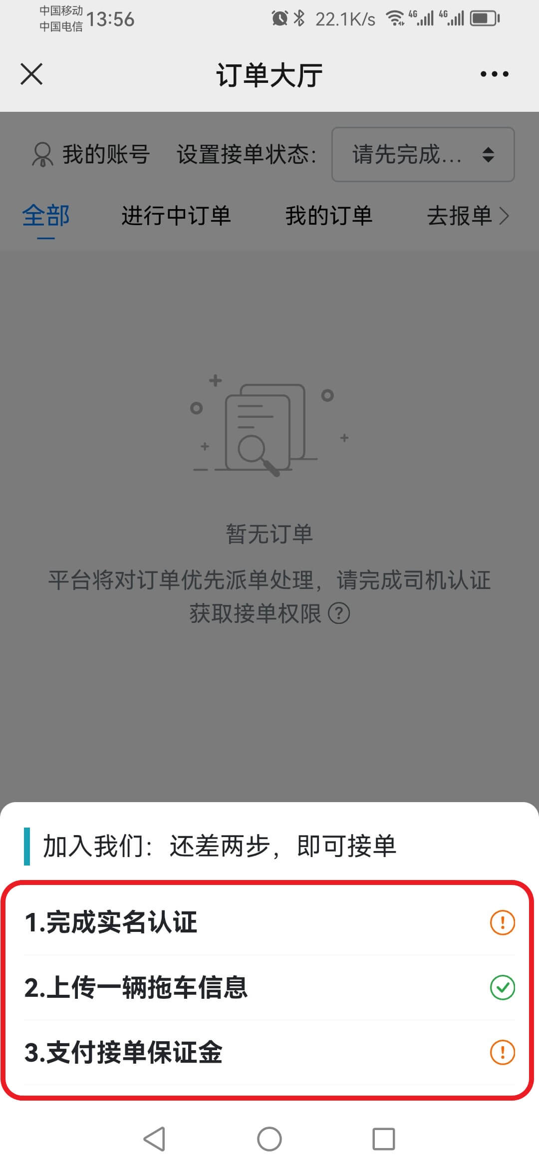 3.按照提示完成注册流程,已完成的项目,右侧将打上绿色对勾“√”标志。*当前活动接单保证金仅需1元,且注销账号全额退!*
